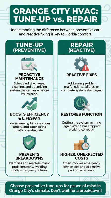 When your AC starts struggling during Orange City's brutal summer months, knowing whether you need a tune-up or repair can save you $300-800 and days of discomfort. Most homeowners can't tell the difference—and that confusion often leads to overpaying for services they don't actually need.